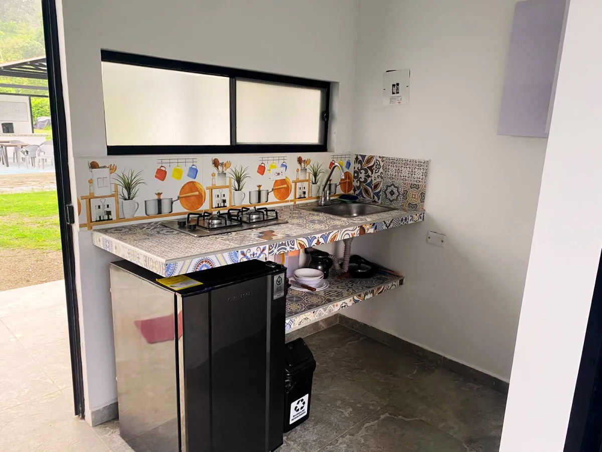 Estufa 2 quemadores, nevera mini, microondas, cafetera, menaje completo.